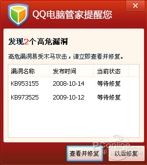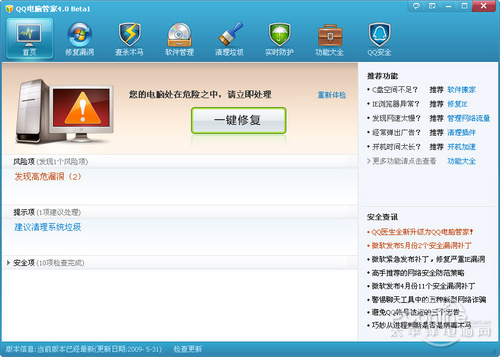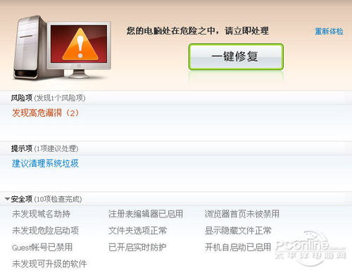 首次运行QQ电脑管家,将自动进行电脑体检操作,一个放大镜不断的围绕着电脑在旋转★★★,检测完毕根据用户计算机系统的状况,将在界面中给予警告图释并以及列表形式列出发现的问题。QQ电脑管家提供了“一键修复”功能★★,让用户只需一点就可以完成安全问题的修复操作。计算机安全检查项目包括了系统漏洞、域名劫持、危险启动项、可升级软件等★。