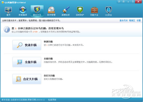 “云”安全一直是安全厂商最近的潮流,QQ电脑管家采用了全新的云查杀技术,拥有速度快、检测更准的特点,强力查杀最新流行木马★★★。新版木马查杀工具给用户提供了三种扫描方式,方便用户根据需要进行快速检测或详细检查。对比起旧版的木马查杀工具来说,新版更易于使用一些★★。