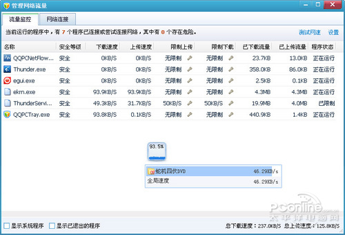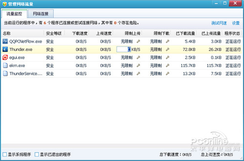 网速太慢★,不知道哪个程序占用了网络资源★★★,QQ电脑管家的“网络流量管理”工具不仅可以查看到所以联网程序★★,还提供了联网程序的安全级别、本机远程IP信息★、上传、以及已下载/上传的流量等信息。用户可以针对某一程序进行上传的限制★★,经笔者测试,限速效果还是比较明显的。