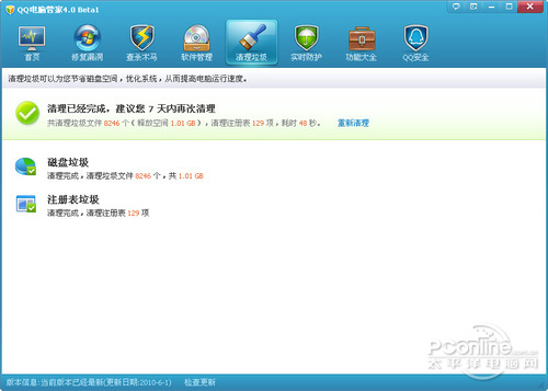 QQ电脑管家的“清理垃圾”功能也有了改变,新版采用了一键清理的操作方式,一键扫描并清理垃圾文件及注册表项目。注意的是★★★,一键清理★★★,用户按了清理键后就会完成垃圾文件的扫描与清理功能。虽然简化了一个步骤步,笔者认为还是提供一个确认选项为好。