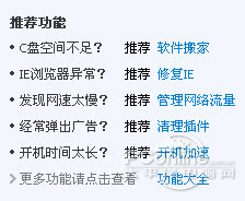 在QQ电脑管家主界面右侧的★★“推荐功能★★”采用了问题引导形式,有利于普通用户根据自己的电脑出现的问题快速定位所需要使用到的功能。同时为了避免某些功能隐藏的较深用户无法立即找到的问题,特别增加了一个★“功能大全★★”选项卡,在该选项卡中集合了QQ电脑管家所有的工具入口★★★。