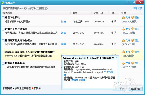 QQ电脑管家新增的“清理插件★★★”工具★★★,将自动扫描系统中安装的所有插件,并给附带了相关插件的分类★★★、安装日期、网友综合评价的信息,协助用户卸载不良或恶意插件。