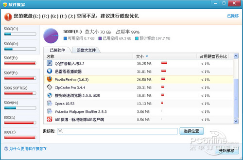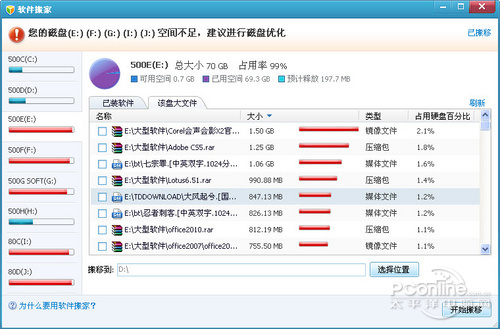 图13 软件搬家工具软件搬家提供了各磁盘分区空间占用情况★★★,用户选择某一分区,就可以查看到在该分区上已安装的软件还可以查看到该分区占用磁盘空间较大的文件。