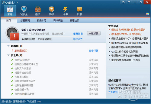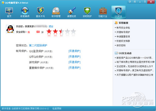 QQ电脑管家的主界面进行了重新的布局,合并并提升了一些原来二级显示的一些功能选项★★★。在界面上采用了较为明亮的浅蓝色底纹,不过QQ电脑管家暂时没有提供换肤功能★★★。