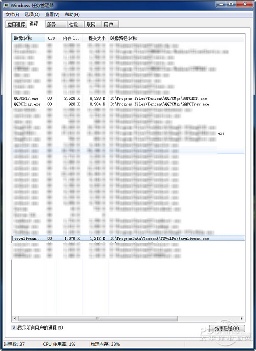 笔者记录了QQ电脑管家在空闲时(开机5分钟内不运行其它任何程序时(静态)),以及在进行病毒扫描时的资源占用情况(动态)。