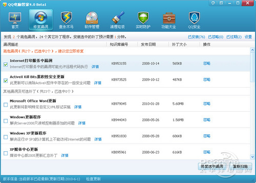 QQ电脑管家的★★“修复漏洞”工具也进行了改进★,新版可以检测到的补丁更加全面(包含了系统★★、微软Office以及应用软件漏洞),而补丁下载修补速度也更加了★★★。而对于检测到的补丁★★★,按照不同的安全级别分成了三类。用户可以查看安全补丁的具体修补内容及发布时间。对于不想安装的补丁★★★,用户可以通过“忽略★”按钮来跳过修复漏洞工具的修补与再次检测、提醒。