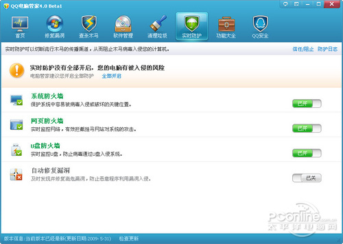 也提供各实时防护防护功能,可以实时监控系统关键位置、防御挂马网页★★、阻止U盘病毒、自动修复漏洞。四大防护体系,构建牢固的电脑安全防线