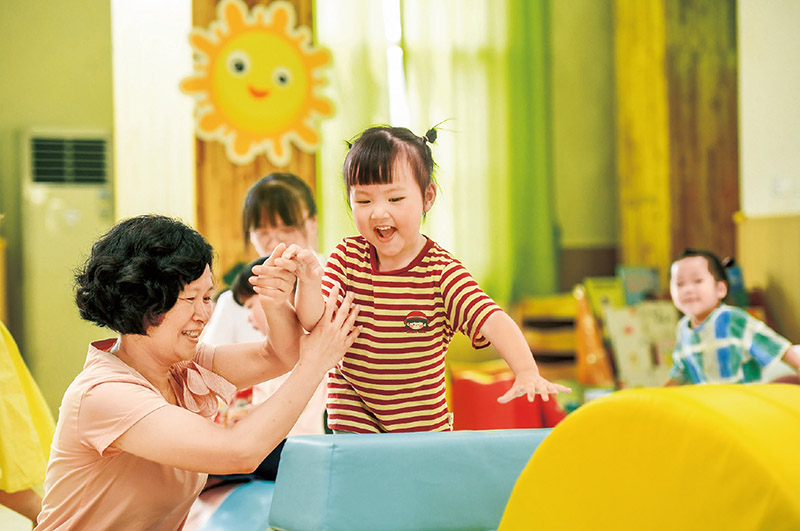 近年来,各地着力解决3岁以下婴幼儿家庭入托难、入托贵等问题,大力发展完善普惠托育服务体系★,不断增强人民群众对普惠托育服务的获得感和满意度,促进婴幼儿健康成长。图为2024年9月4日,江西省奉新县示范幼儿园托育班的老师和孩子们在快乐地玩耍。 人民图片 周亮/摄