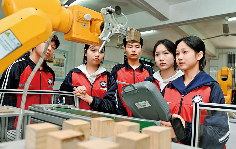 近年来,各地加强人力资源开发利用,大力发展职业教育★,针对性地培育人才市场需求的专业技术人才,促进人口高质量发展。图为2024年10月29日,湖南省洞口县雪峰博雅职业技术学校,学生在练习工业机器人物品搬迁实践操作。 人民图片 滕治中/摄