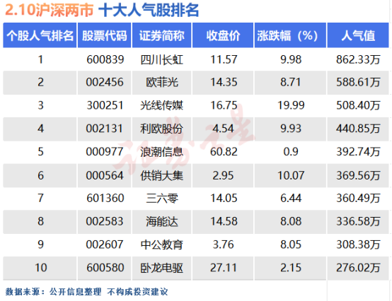 扫描或点击关注中金在线日沪深两市双双收涨,成交量有所萎缩。板块上通信服务AG旗舰厅app下载★、软件开发涨幅居前★★,银行★、港口航运跌幅居前。人气股方面四川长虹、光线传媒、利欧股份★★、供销大集收于涨停,浪潮信息上涨0.9%成为十大人气股中唯一收跌个股。下面是今日十大人气股排名的详细情况★。